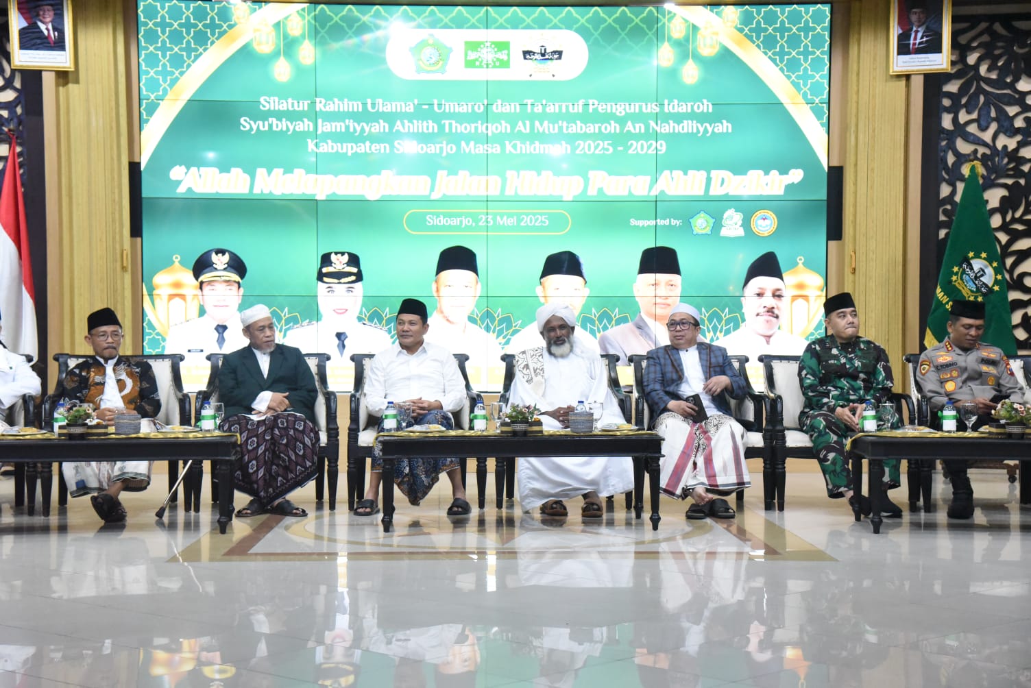 Afeksi.com- Sejumlah kyai dan ustad hadir pada kegiatan silaturahim ulama umaroh di pendopo Delta Wibawa Jumat malam, (23/5). Kegiatan yang dibarengi dengan taaruf syu’biyah atau perkenalan pengurus Jam’iyyah Ahlith Thoriqoh Al Mu’tabaroh An Nahdliyah/Jatman Kabupaten Sidoarjo masa khidmaf 2025-2029 tersebut dihadiri Forkopimda Sidoarjo. Diantaranya Bupati Sidoarjo H. Subandi, Kapolresta Sidoarjo Kombespol Christian Tobing serta Dandim 0816 Sidoarjo Letkol Inf Dedyk Wahyu Widodo. Dalam kesempatan itu juga diundang ulama besar dari Sudan Syech Awad Aqli. Bupati Sidoarjo H. Subandi bangga pendopo Delta Wibawa dimanfaatkan untuk kegiatan silaturahmi seperti ini. Ia berharap lewat kegiatan tersebut akan mempererat kebersamaan dan sinergitas antara ulama dan umaro dalam membangun Kabupaten Sidoarjo. Dikatakannya sinergitas antara ulama dan umara sangat penting dalam membangun daerah. “Kami membutuhkan nasihat dan bimbingan dari para ulama,”ucapnya. Disampaikannya juga bahwa keharmonisan dalam membangun Kabupaten Sidoarjo harus selalu dijaga. Hal itu menurutnya menjadi kunci utama membangun Kabupaten Sidoarjo yang lebih maju dan sejahtera. “Mari bangun sinergitas untuk membangun Kabupaten Sidoarjo yang aman, damai, dan sejahtera,” ajaknya. Dalam kesempatan itu, Bupati H. Subandi juga mengungkapkan program yang akan dijalankan untuk lima tahun kedepan. Diantaranya pemberian bea siswa keagamaan maupun insentif bagi guru ngaji. “Kami tidak hanya fokus pada pembangunan fisik saja, tetapi juga pembangunan mental dan spiritual,” ucapnya. (Afeksi.com)