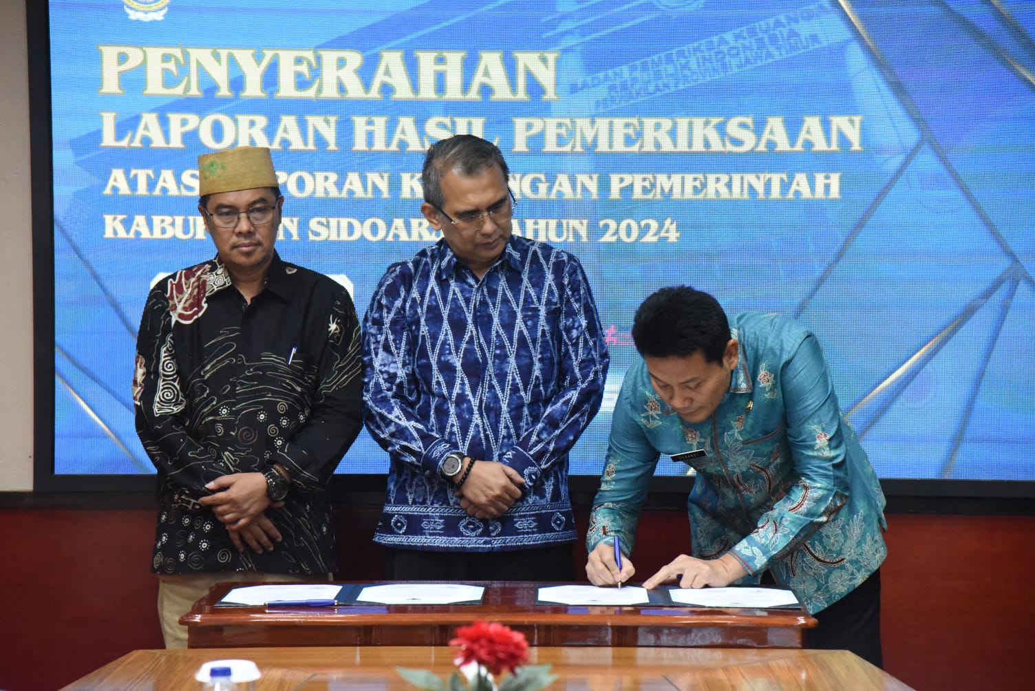 Sidoarjo*- Laporan Hasil Pemeriksaan (LHP) terhadap Laporan Keuangan Pemerintah Daerah (LKPD) Tahun 2024 Pemerintah Kabupaten Sidoarjo mendapat opini Wajar Tanpa Pengecualian (WTP) dari BPK Perwakilan Provinsi Jawa Timur. Capaian itu menjadi yang ke 12 kali berturut-turut yang diperoleh Kabupaten Sidoarjo sejak tahun 2013 lalu. Pemkab Sidoarjo adalah daerah kedua penerima LHP LKPD 2024 dari 38 Kabupaten/kota di Jatim. Pasalnya penyampaian LKPD unaudited tahun 2024 kepada BPK Perwakilan Jatim kemarin dapat tepat waktu. Pagi tadi, LHP LKPD Kabupaten Sidoarjo tahun 2024 itu diserahkan kepada Bupati Sidoarjo H. Subandi oleh Kepala BPK Perwakilan Provinsi Jawa Timur Yuan Candra Djaisin dikantor BPK Perwakilan Provinsi Jawa Timur, Kamis (17/4). LHP LKPD Kabupaten Sidoarjo tahun 2024 itu juga diserahkan kepada Ketua DPRD Kabupaten Sidoarjo Abdilah Nasih. Dalam penyerahannya Bupati Sidoarjo H. Subandi didampingi Sekda Sidoarjo Fenny Apridawati serta Inspektur Kabupaten Sidoarjo Andjar Surjadianto dan Kepala Badan Pengelolaan Keuangan dan Aset Daerah (BPKAD) Kabupaten Sidoarjo Chusnul Inayah. Bupati Sidoarjo H. Subandi bersyukur untuk kedua belas kali berturut-turut Pemkab Sidoarjo mampu mempertahankan capaian opini WTP. Menurutnya hal itu menjadi bukti bahwa Pemkab Sidoarjo mampu menyajikan laporan keuangan daerah yang transparan dan akuntabel sesuai regulasi yang ada. Hal itu juga berarti setiap pembelanjaan APBD Kabupaten Sidoarjo sesuai regulasi dan transparansi. “Penyusunan Laporan Keuangan Pemerintah Daerah menjadi kewajiban utama pemerintah daerah dalam mempertanggungjawabkan pengelolaan keuangan, Alhamdulillah kita mampu mempertahankan capaian opini WTP,”ujarnya. Menurut Bupati H. Subandi, laporan ini bukan hanya menjadi instrumen penting dalam transparansi dan akuntabilitas keuangan daerah. Namun juga sebagai sarana untuk mengevaluasi kinerja pemerintah daerah. Ia berharap capaian opini WTP dapat terus dipertahankan. “Capaian Opini WTP ini penting dipertahankan, alasannya menjadi bentuk komitmen pemerintah daerah Kabupaten Sidoarjo dalam mengelola APBD secara transparan dan akuntabel,”ujarnya. Bupati H. Subandi mengatakan capaian opini WTP merupakan kerja keras bersama seluruh Aparatur Sipil Negara (ASN) Sidoarjo. Untuk itu ia akan terus mendorong jajaran Organisasi Perangkat Daerah (OPD) untuk dapat mempertahankannya. “Kami akan terus mendorong seluruh OPD untuk mempertahankan Opini WTP di tahun-tahun berikutnya,” pinta H. Subandi. (Afeksi)