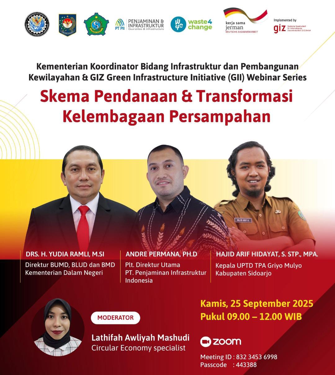SIDOARJO – Upaya memperkuat tata kelola persampahan terus dilakukan pemerintah bersama berbagai pihak. Kementerian Koordinator Bidang Infrastruktur dan Pembangunan Kewilayahan berkolaborasi dengan GIZ Green Infrastructure Initiative (GII) menggelar webinar bertajuk Skema Pendanaan & Transformasi Kelembagaan Persampahan, Kamis (25/9).